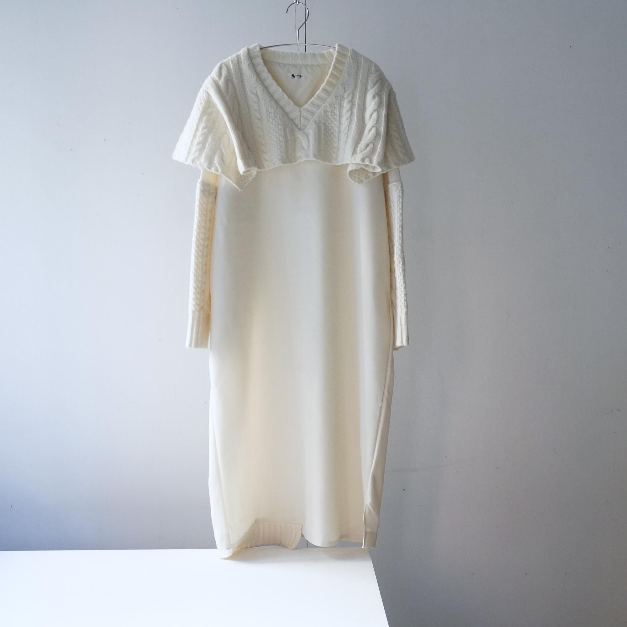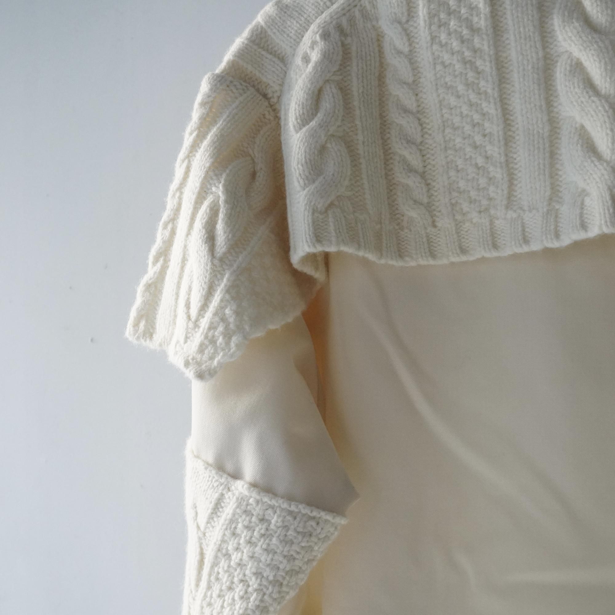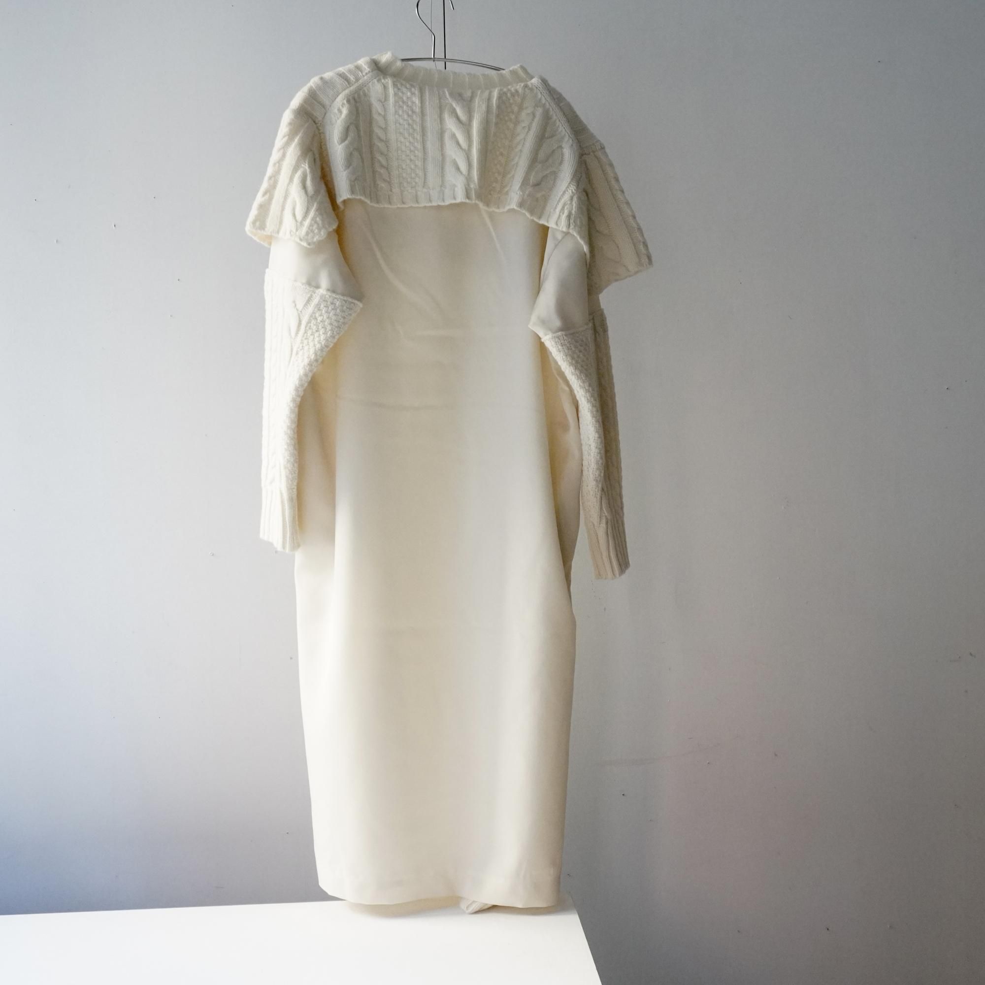 ケーブルニットとコーティングしたウールギャバジンとのコンビのワンピース